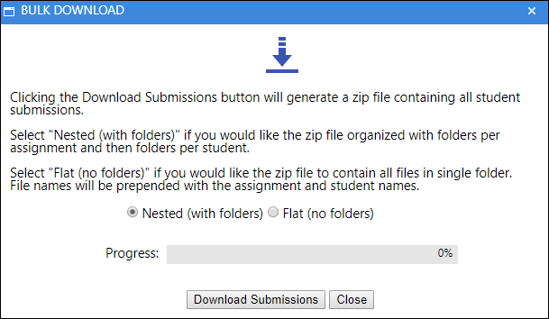 TheBulk Download window guides instructors through downloading currently submitted resource files. To view each file organized in subfolders according to assignment and then student, select theNested (with folders)radio button and clickDownload Submissions. Files downloaded in this manner are named according to their attempt number, student ID, student name, and submission name.