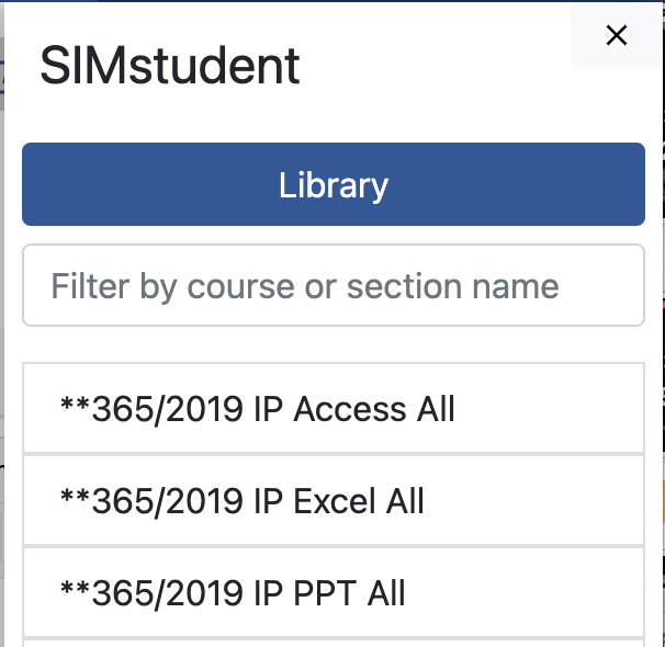 Clicking the SIMstudent link brings up a list of your assigned courses and the Library link. Click the Library link to view your student's library, based of all assigned books in all of your courses. Click the specific course link to impersonate a student in that course.