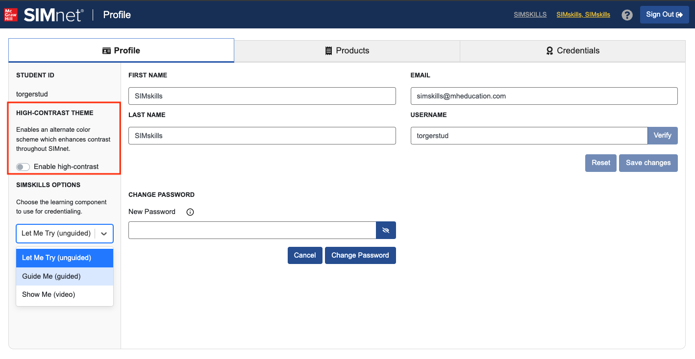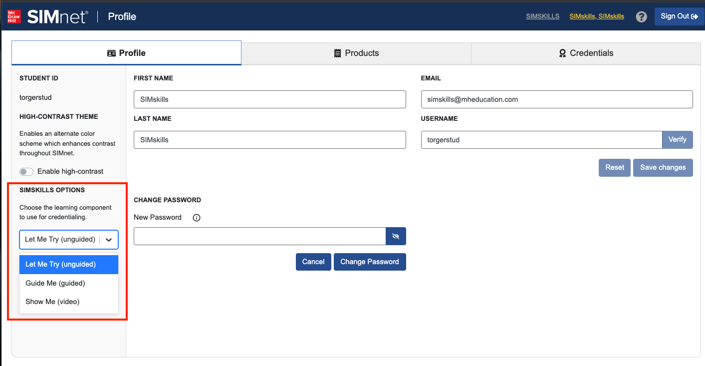 To enable the Guide Me or Show Me to qualify for badge completion instead of the Let Me Try click your name in the top navigation bar to access your profile. In the left page, click the SIMskills Options dropdown and select either he Guide Me (guided) or Show Me (video) option.&#x20;